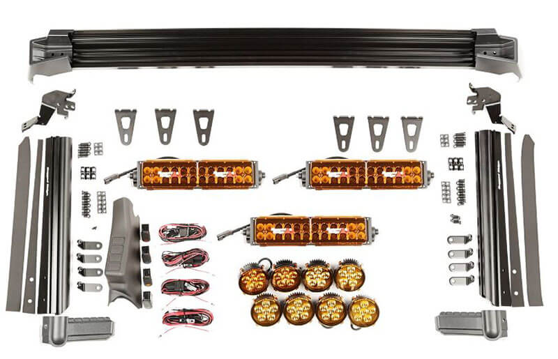 The 11232.57 kit comes with the Elite Fast Track windshield light bar, three 13.5” 72W LED light bars with a versatile Flood/Driving/Combination pattern, eight 3.5” 18W round LED lights with a Driving light pattern, a full set of Amber light covers, an A-pillar switch pod, four rocker switches, and wiring harnesses.