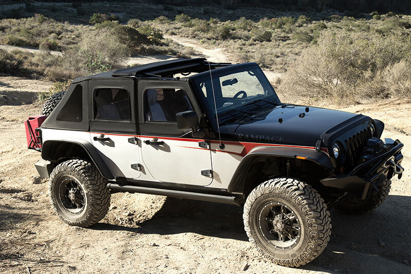 The original frameless Rampage Products top is back with a vengeance, headlined by a patent-pending retractable sunroof that can be opened with one hand from inside your Jeep Wrangler for open-air driving. Available for Wrangler (139935) and Wrangler Unlimited (139835) in black diamond sailcloth with tinted windows, the TrailView also includes removable rear and side windows that quickly convert the soft top into an open safari top.
