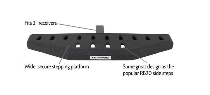 The RB20 hitch step from Go Rhino adds a popular Raptor-style element to the back of your truck. Enhanced with RB20 series-style louvers, its 36” wide step surface provides a safe way to get up into the bed or stand and work. This one-piece, mild-steel component fits 2-inch receivers. Available in two finishes: textured bedliner (RB620T) or textured black powdercoat (RB620PC).