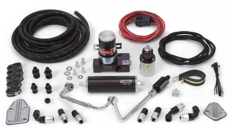 Complete fuel system kits from Russell include a state-of-the-art Edelbrock electric fuel pump that offers maximum performance in a compact package. Kits also contain matching fuel pressure regulator (if required), a Russell ProFilter fuel filter, a dual-feed carb kit with fittings (for carb applications), a fuel pump relay and wiring assembly, 20’ of Russell ProClassic or traditional ProFlex hose, plus an assortment of hose ends, adapters, and mounting brackets. Available with red/blue or black/silver fittings for a unique look.
