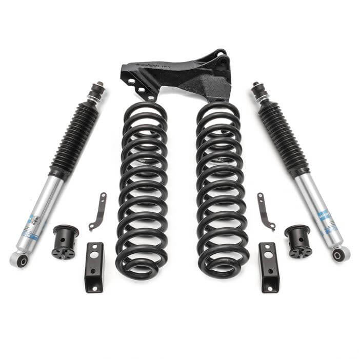 The 2.5” coil spring leveling kit for 2017–2018 Ford Super Duty (F-250/F-350) from ReadyLIFT just got better: now with a set of Bilstein 5100 series front shocks and front track bar relocation bracket (rear shocks also available)! With this kit, your Ford work truck is guaranteed to handle and ride better than ever before on or off the pavement. Allows for up to 35” tires for a more commanding view of the road. Includes model-specific brake line extension brackets.