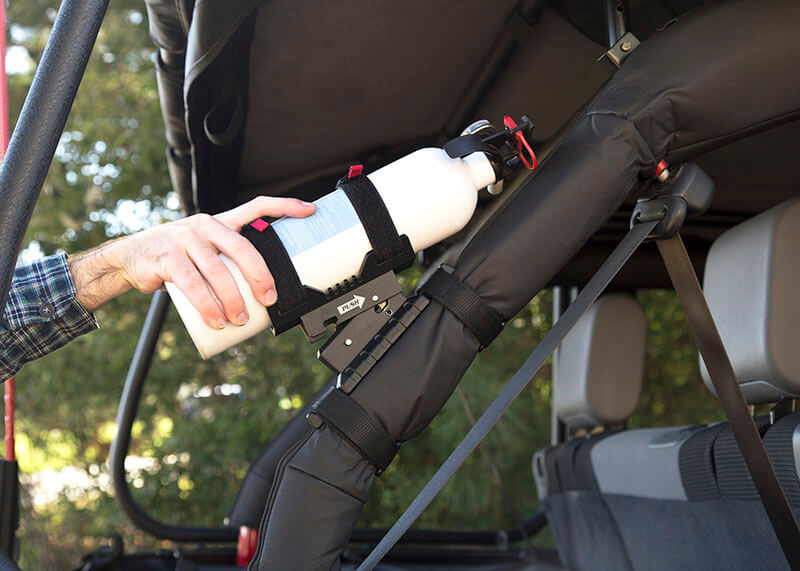 With its brilliant cast aluminum construction and one-hand spring-loaded release mechanism, the Elite billet-style aluminum fire extinguisher holder from Rugged Ridge brings both form and function to your 1976–2018 Jeep Wrangler or CJ.