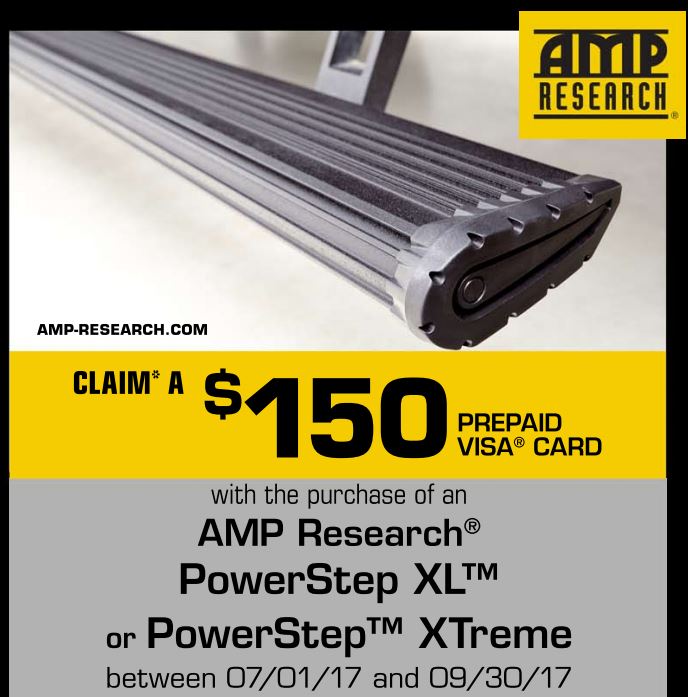 AMP Research: $150 Prepaid Visa with PowerStep XL or XTreme Purchase July 3, 2017June 30, 2017 David Ayers Industry, News, Rebates Via mail-in rebate. Offer valid July 1 to September 30, 2017, on PowerStep XL and XTreme versions only (not base PowerStep). Click image for printable form and complete details!