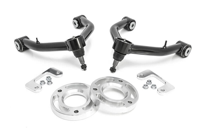 The 66-2120 kit is constructed from aircraft-grade 6061-T6 billet aluminum and precision-machined for provide an exact fit. It includes new alignment cam plates and nut to ensure alignment and geometry. You can install up to a 295/60-20 tire on a 20×9 +18 wheel without trimming. DIYers can complete installation of this ReadyLIFT kit in about 2.5 hours.
