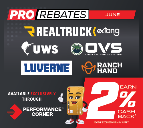 Offered exclusively through your Performance Corner® warehouse distributor, the PRO Rebates program gives you cash back on your purchases of certain vendors during special promotional periods throughout the year. With rebates ranging from 2% to 5%, the more you buy, the more you get back! Rebates are automatically mailed to you in the form of prepaid Visa debit cards to spend as you see fit.